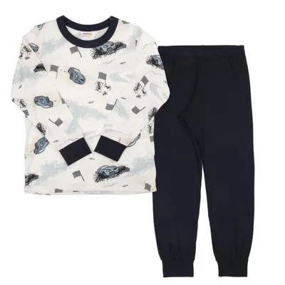 Blødt Joha nattøj i to dele, der består af en natbluse og et par natbukser. Natblusen er i råhvid med allover print. Natbukserne er i ensfarvet oliven. Natblusen har en rund hals med en smal, oliven ribkant, og den har lange ærmer med brede, oliven elstikkanter. Natbukserne har en smal elastikkant i livet, og buksebenene har brede ribkanter.