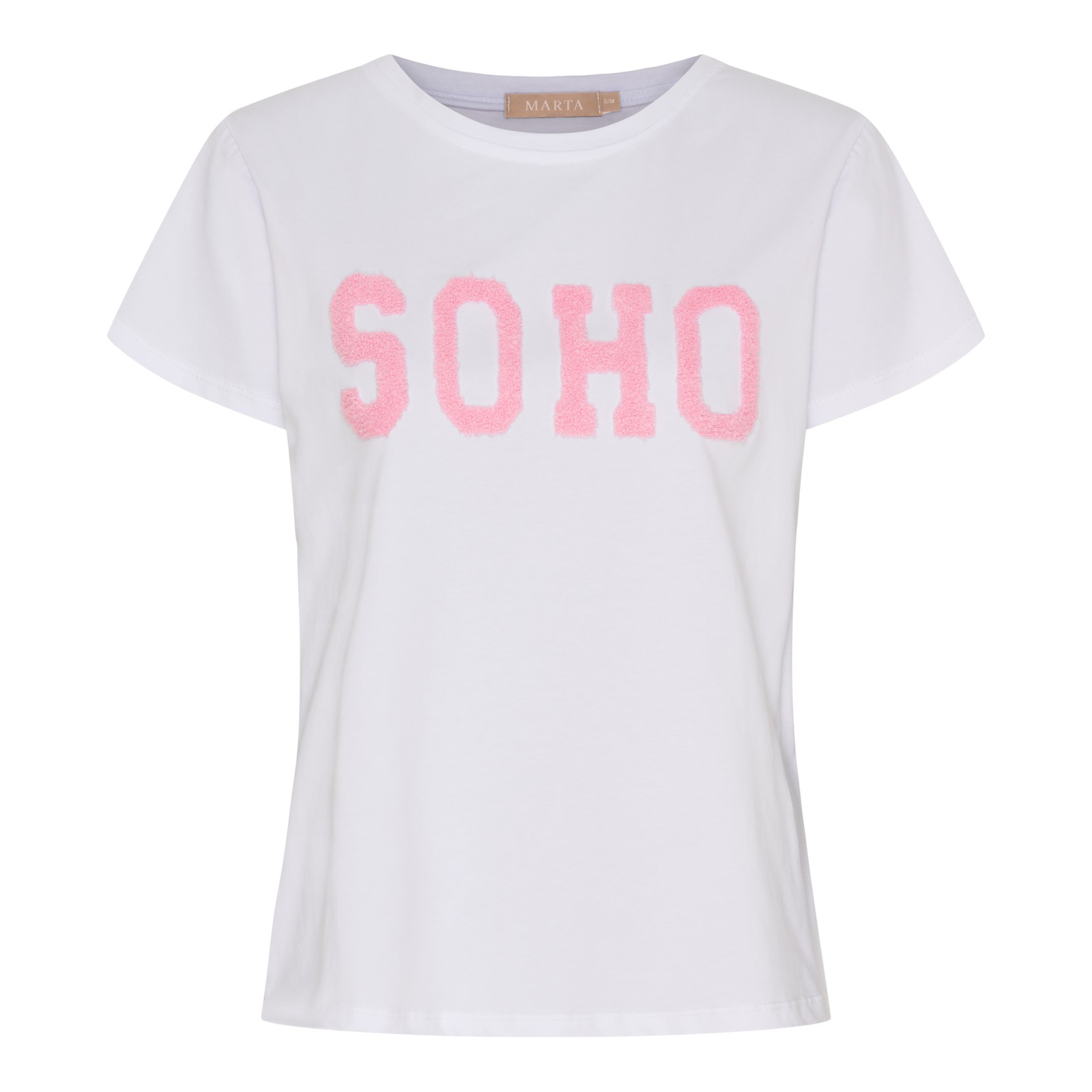 Herdis T-shirt fra Marta er en feminin og afslappet T-shirt med et cool statement-look. Teksten “SOHO” på fronten har en let fluffy struktur, som giver et moderne og sjovt udtryk. T-shirten har klassisk rund hals, korte ærmer og en behagelig pasform. Nem at til både hverdag og mere afslappede anledninger. *90% Bomuld