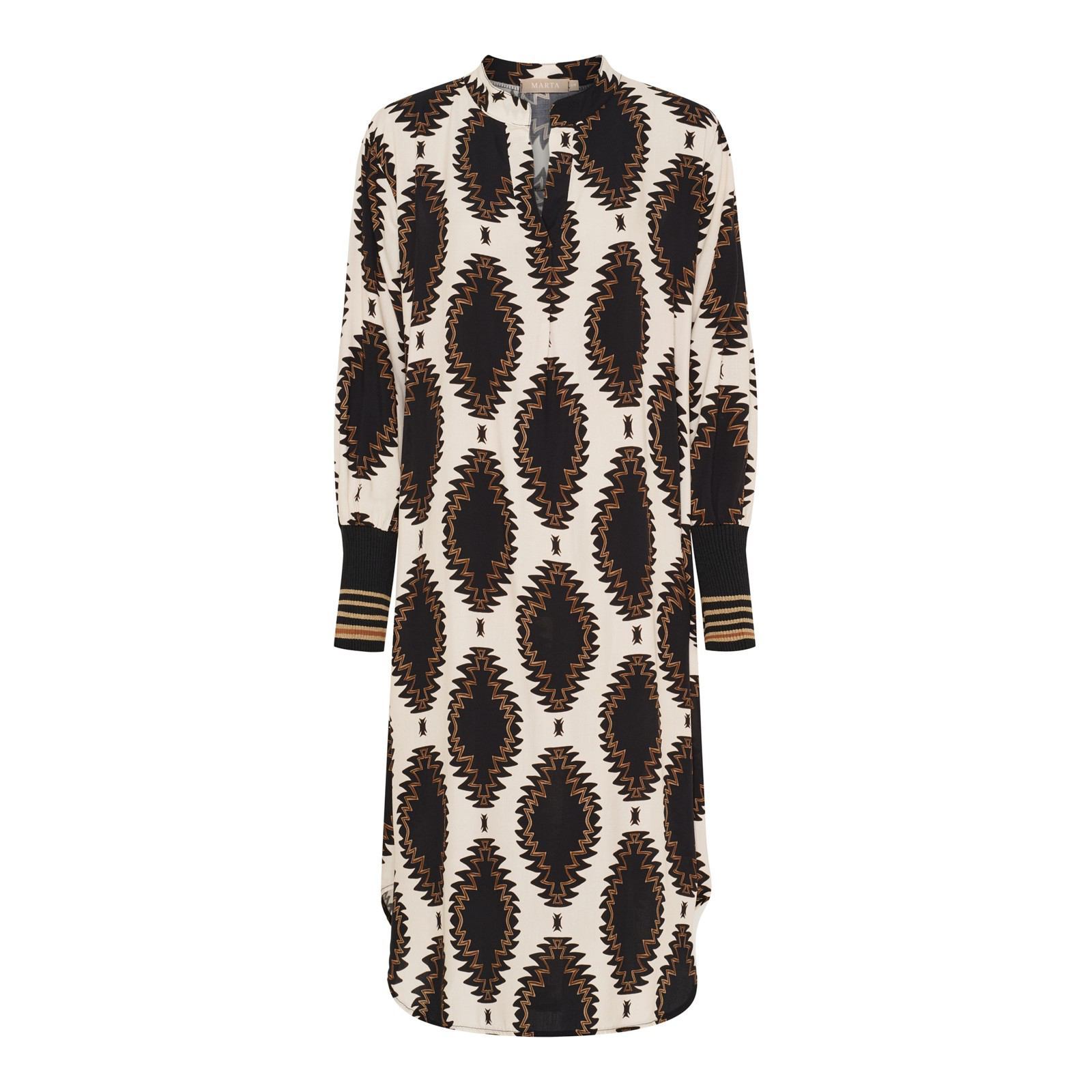 Flot kjole fra Marta i et smart print. Kjolen har V-udskæring med en lille krave og ribkant på ærmet. Den har en flot afrundet skæring nederst som tiolfører lidt lethed til kjolen. Super flot at style til et par lange støvler eller brug den med bukser under.