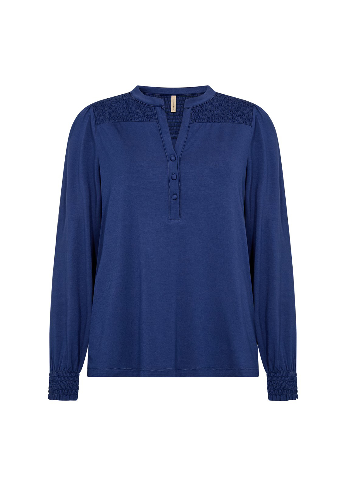 Soya Concepts Marica bluse er en klassisk bluse som er fremstillet i en skøn lyocell kvalitet. Blusen har en flot delt hals, stolpelukning, lange ballonærmer, smockmanchetter og en løs pasform.